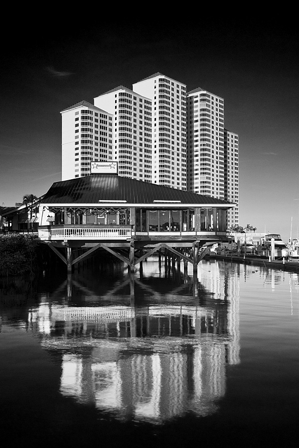 I hear a motor. A shrimper rounds the point a couple of hundred yards north of me, and heads out, following the channel. I wait for her to enhance my composition. She recedes into the distance more quickly than she nears my cumulus backdrop. Finally - but she is small in the frame. I pop off a few frames as the shrimper heads for the clouds on the horizon. I close in for one shot at the long end of the zoom range - forty millimeters. That's the one.